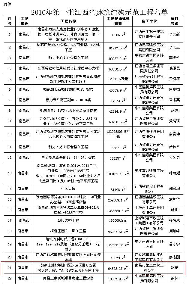 由南昌市第二建筑工程公司承建的郭家莊B地塊棚戶區(qū)改造項(xiàng)目(安置房)5#、6#、7#、8#樓及地下車(chē)庫(kù)工程獲“2016年第一批江西省建筑結(jié)構(gòu)示范工程” [摘自贛建質(zhì)監(jiān)字[2016]1號(hào)]。