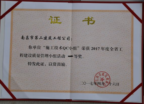 技術(shù)質(zhì)檢部貫徹公司質(zhì)量標(biāo)準(zhǔn)化管理精神,以切實提高工程質(zhì)量為目標(biāo),積極開展全面質(zhì)量管理技術(shù)攻關(guān)活動,所撰寫的《提高GC泡沫水泥保溫板外墻外保溫施工質(zhì)量 》QC課題成果,榮獲“2017年度全省工程建設(shè)優(yōu)秀質(zhì)量管理小組活動一等獎”。